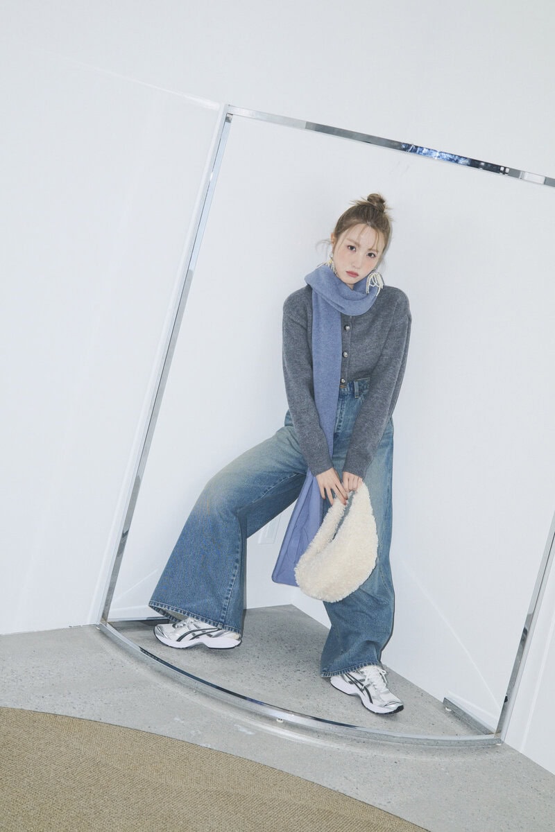 スニーカー¥19,800/アシックス(アシックスジャパン カスタマーサポート部)、ニットカーデ¥6,990/マンゴ、デニムパンツ¥14, 300/ラングラー(エドウイン・カスタマーサービス)、マフラー¥7,870/エンゾーブルース(HANA KOREA)、イヤリング¥4,290/マチルダローズ(ハチマルゴショールーム)、ファーバッグ¥23,100/カルバン・クライン(カルバン・クライン カスタマーサービス)