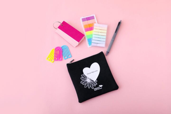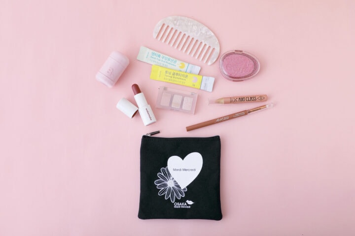 小さめバッグにも収まる、使いやすいサイズ感。見た目以上の収納力があり、アイブロウなどのペンタイプも入ります。オリジナルのOSAKAロゴにもご注目♡