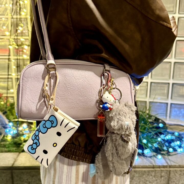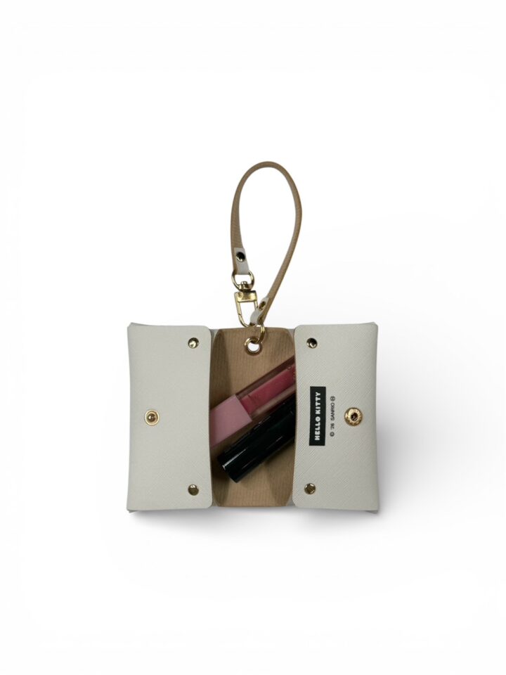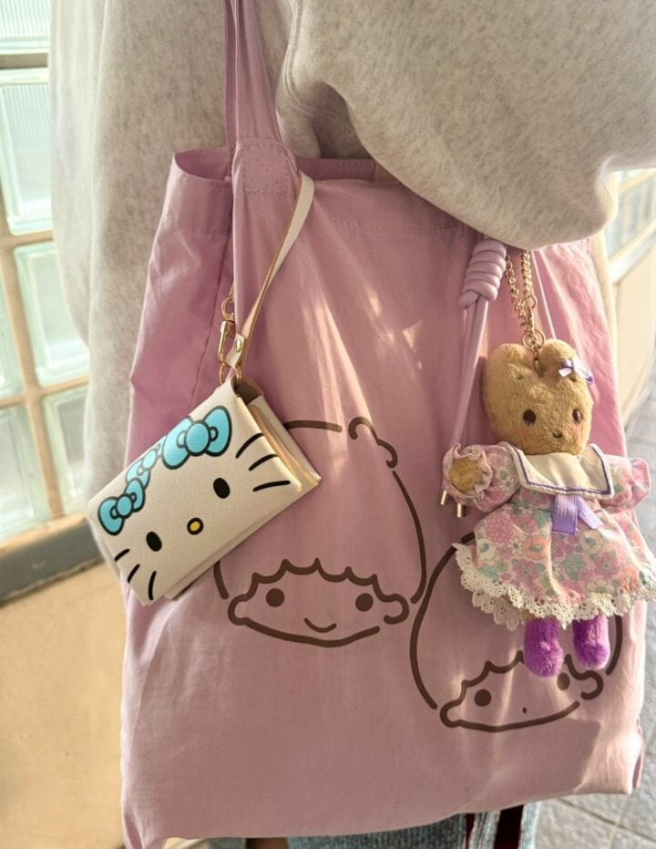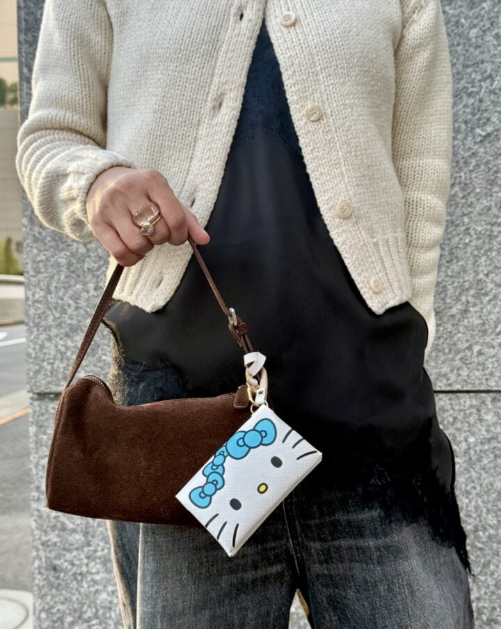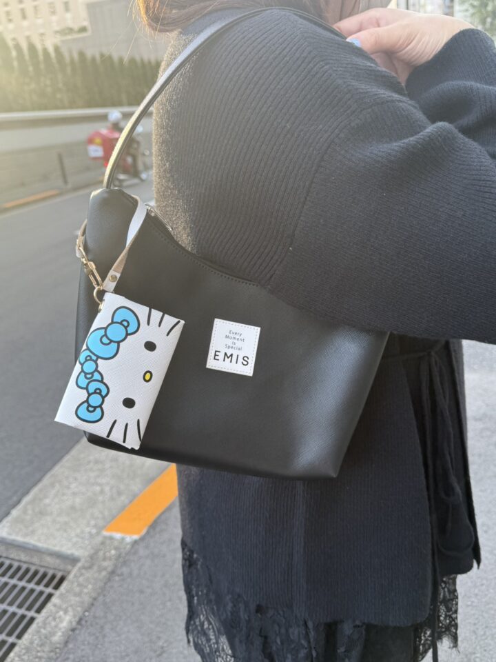編集H「リップケースとして使う のもあり! スタメンのリップ&グロスを2本入れています。シンプルなワンハンドルの黒バッグもキティでキュートに♡」