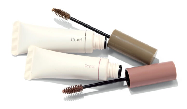 「とかすだけで、うすふわ眉に仕上がる眉マスカラは抜け感メイクの必需品。パリパリ眉もペタッと眉も無縁!」〈上から〉ピメル うそつき眉マスカラ マイルドベージュ、ダスキーローズ(限定色)各¥1,320/pdc(0120-127131)
