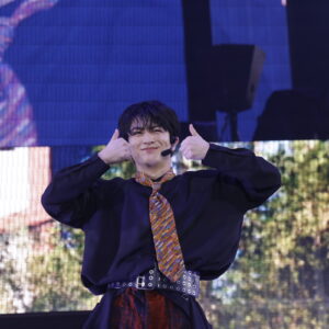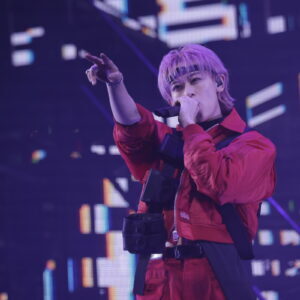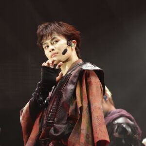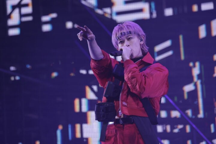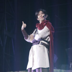1曲目「REAL」をクールにパフォーマンスすると、続いてヘビーメタルなゴリゴリサウンドが鳴り響く「メタルなかよし」では一転、コミカルな雰囲気に。8号車との完璧なコール&レスポンスで会場の一体感もバッチリ。なつかしの「ドンキーコング」のような映像に、「ドラゴンクエスト」の勇者のような衣装で、ゲーム感満載の演出にワクワク! パフォーマンス中にも、映像のドラゴンにやられたメンバーたちが次々と退場し、最後に残ったリョウガが剣でドラゴンを倒してWIN!という展開。こうした小芝居が途中に入るのは、超特急らしいユーモアを感じます。