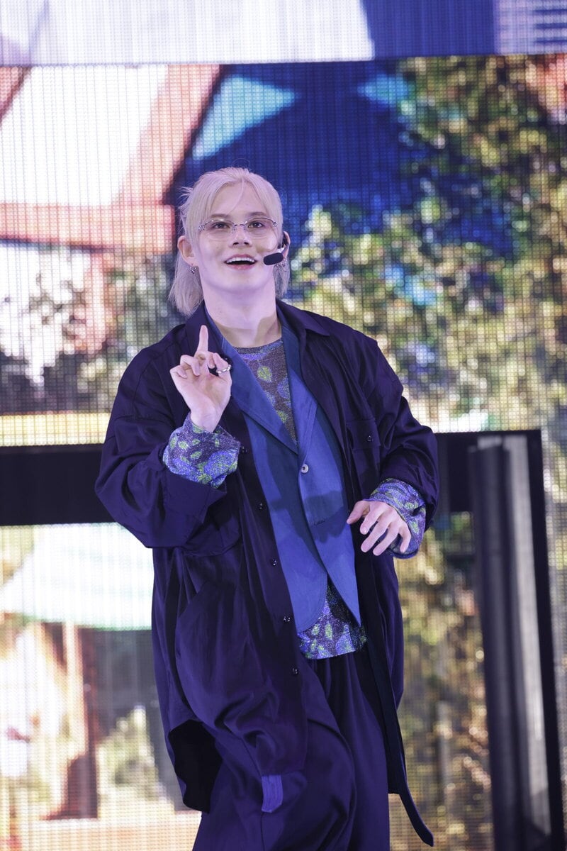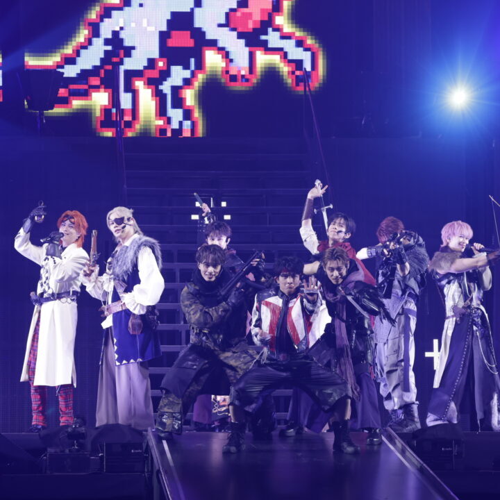 1曲目「REAL」をクールにパフォーマンスすると、続いてヘビーメタルなゴリゴリサウンドが鳴り響く「メタルなかよし」では一転、コミカルな雰囲気に。8号車との完璧なコール&レスポンスで会場の一体感もバッチリ。なつかしの「ドンキーコング」のような映像に、「ドラゴンクエスト」の勇者のような衣装で、ゲーム感満載の演出にワクワク! パフォーマンス中にも、映像のドラゴンにやられたメンバーたちが次々と退場し、最後に残ったリョウガが剣でドラゴンを倒してWIN!という展開。こうした小芝居が途中に入るのは、超特急らしいユーモアを感じます。