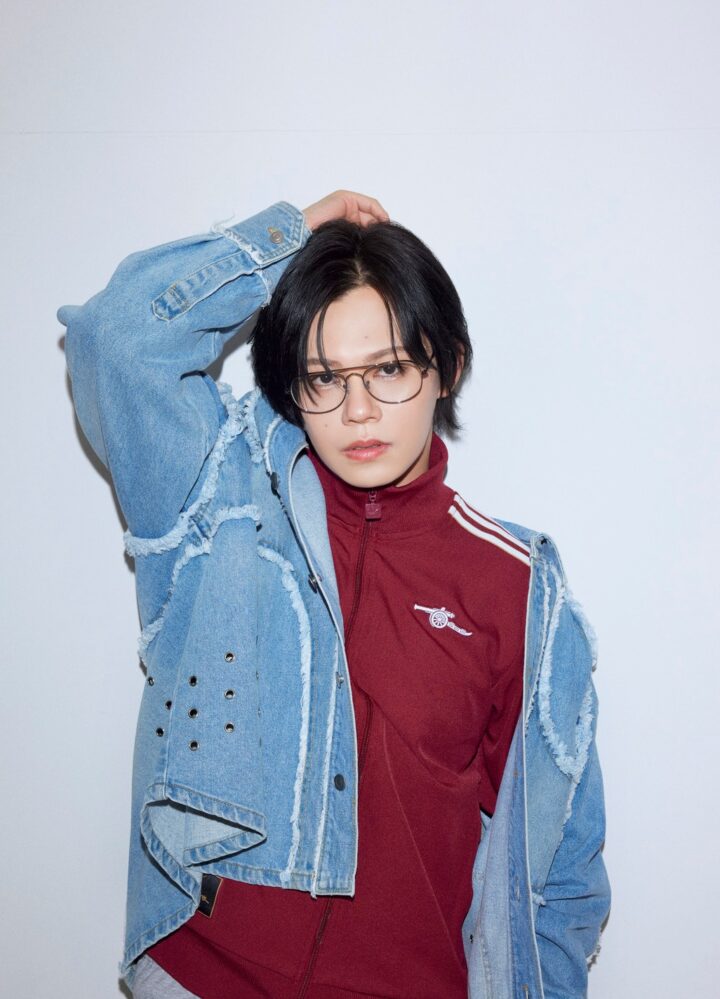 メガネ¥25,740/レイバン(ルックスオティカジャパン カスタマーサービス)、デニムジャケット¥57,200/リベーレ(WTS ROOM)、トラックジャケット¥15,400/アディダス オリジナルス(アディダス コールセンター)