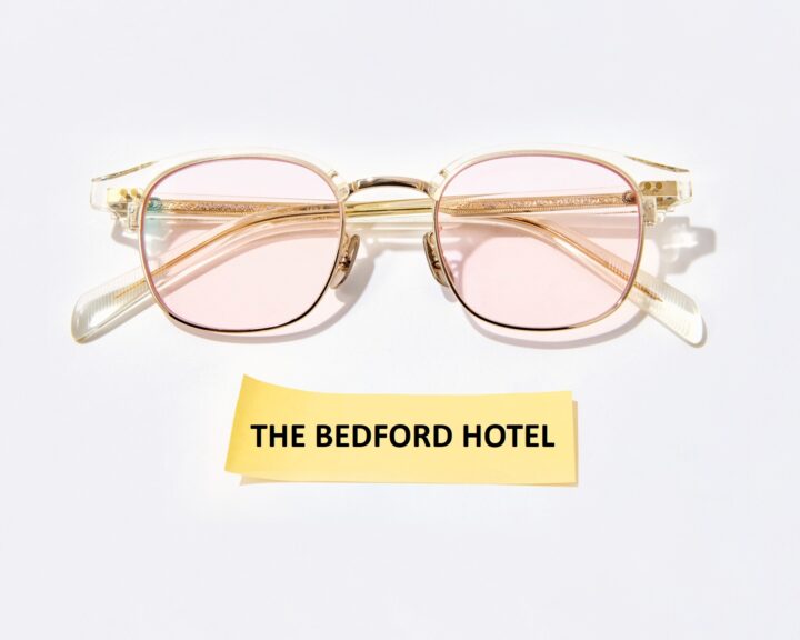 細めのべっ甲柄のフレーム×ピンクのレンズで、シンプルながら目元を華やかに。¥23,100/ザ ベッドフォード ホテル(キングスター)