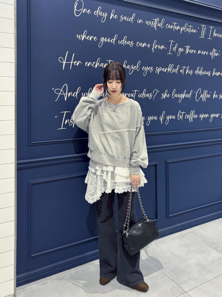 スウェット×デニムの定番スタイルにレーススカートをレイヤードして旬の着こなしに。リメイク風のデザインが可愛いスウェットはワンショルっぽく着てヘルシーに肌見せ。コンパクトサイズでバランスよくコーディネイトしてみました。