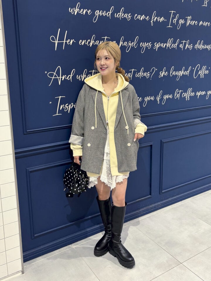 ジャケット¥9,900、フーディ¥7,150、ミニスカート¥6,600、ヘアアクセサリー¥1,100、バッグ¥5,990、ブーツ¥12,100/以上すべてローリーズファーム(アダストリア カスタマーサービス)