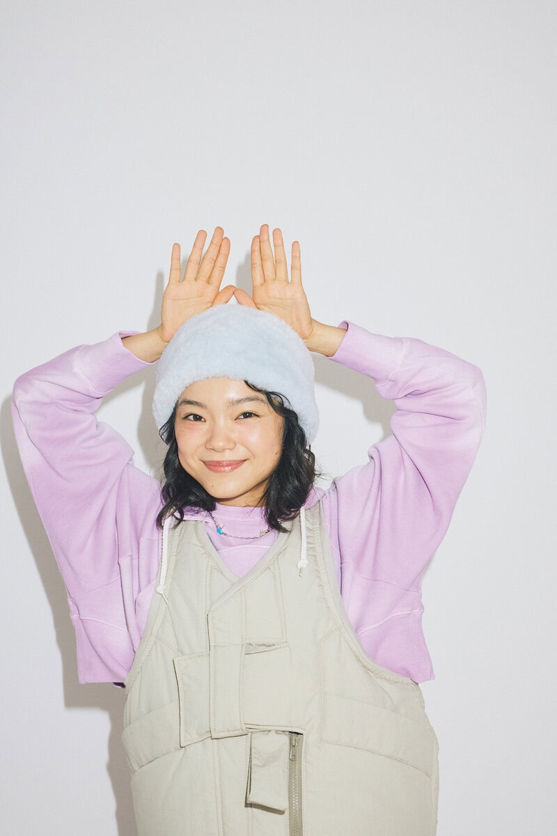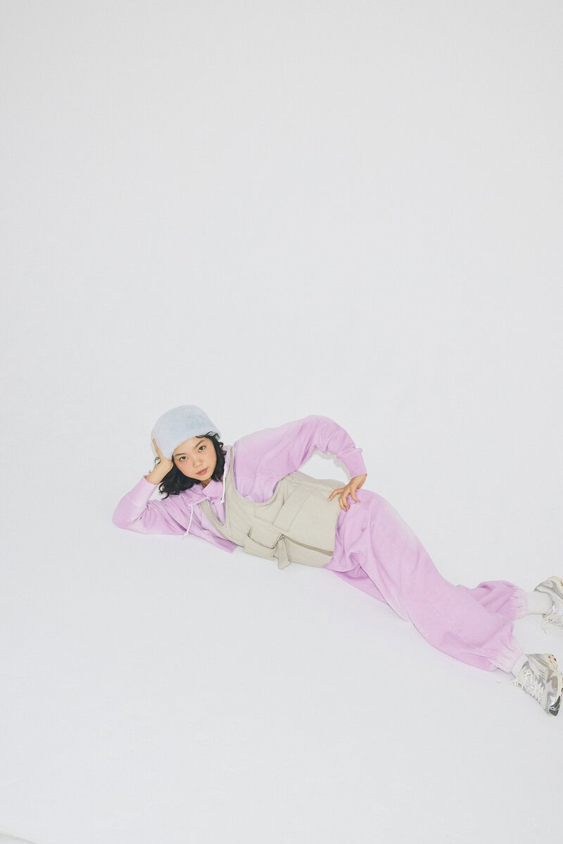 スウェットフーディ¥20,900、スウェットパンツ¥20,900、ネックレス¥52,800 /以上すべてロドリリオン(ネペンテス ウーマン トウキョウ)、イヤマフ¥3,960 /レイビームス(レイ ビームス 新宿)、ベスト¥61,600 /イオリ シゲカタ(ループトーキョウ)、ソックス¥990 /靴下屋(タビオ)、スニーカー¥16,500 /ミズノ(ミズノ お客様相談センター)