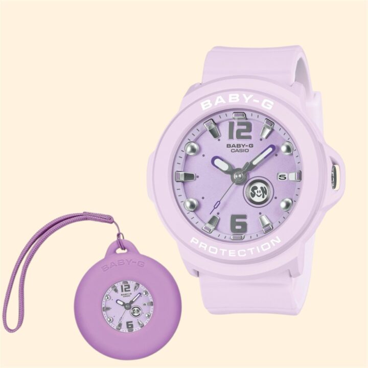 時刻が見やすい3針タイプのシンプルなダイアルでデイリー使いに最適。センターケースを付属の専用ホルダーにセットすればチャームに早変わり。曜日表示はデザインが日替わりで変わるという楽しい仕掛けも。¥12,100/ベイビージー(カシオ計算機 お客様相談室)