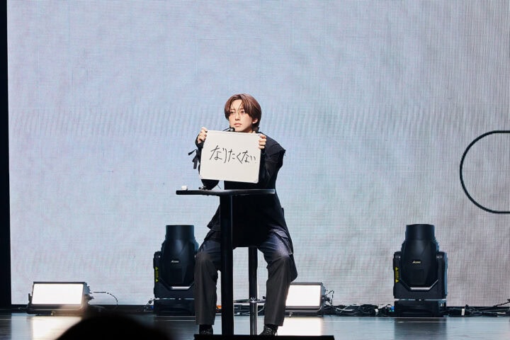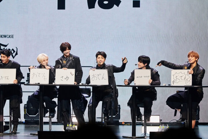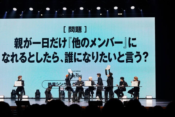 続いての「1日だけ他のメンバーになれるとしたら、誰になりたいと言う?」というお題の親はFUMAに。メンバーから「斜め上の回答をしてくる」と予想されたFUMA。書いたフリップをLUNÉだけに見せると、そこには“なりたくない”との文字が! ドヤ顔で「こういった質問が多いから答えは結構決まっていて、メンバーもわかってくれていると思う」とコメントでさらに後押し。会場からは笑いが起き、その反応に惑わされていくメンバーたち(笑)。考えた末にメンバーが出したのはHARUA「TAKI」、EJ「だれもいない」、JO「TAKI」、YUMA「かわらない」、K「TAKI」、NIGOLAS「EJ」、TAKI「K」という回答。しっかり斜め上の回答だったのに、二人は当てている!! すげーーー! さすが、なんでもお見通しのメンバーです。