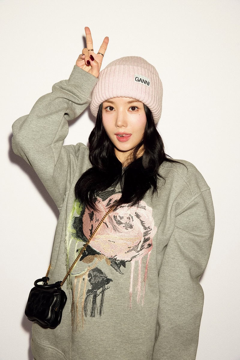 スウェットトップス¥59,400、ニット帽¥ 27,500、バッグ¥44,000[以上すべて参考価格]/以上すべてガニー、左手人さし指リング¥17,600/ガルニ(ガルニトウキョウ)、その他アクセサリー/本人私物