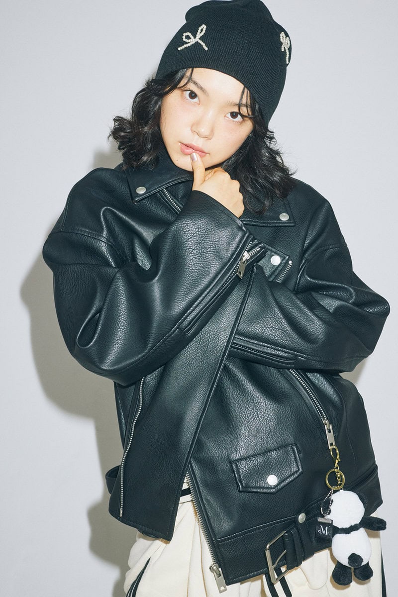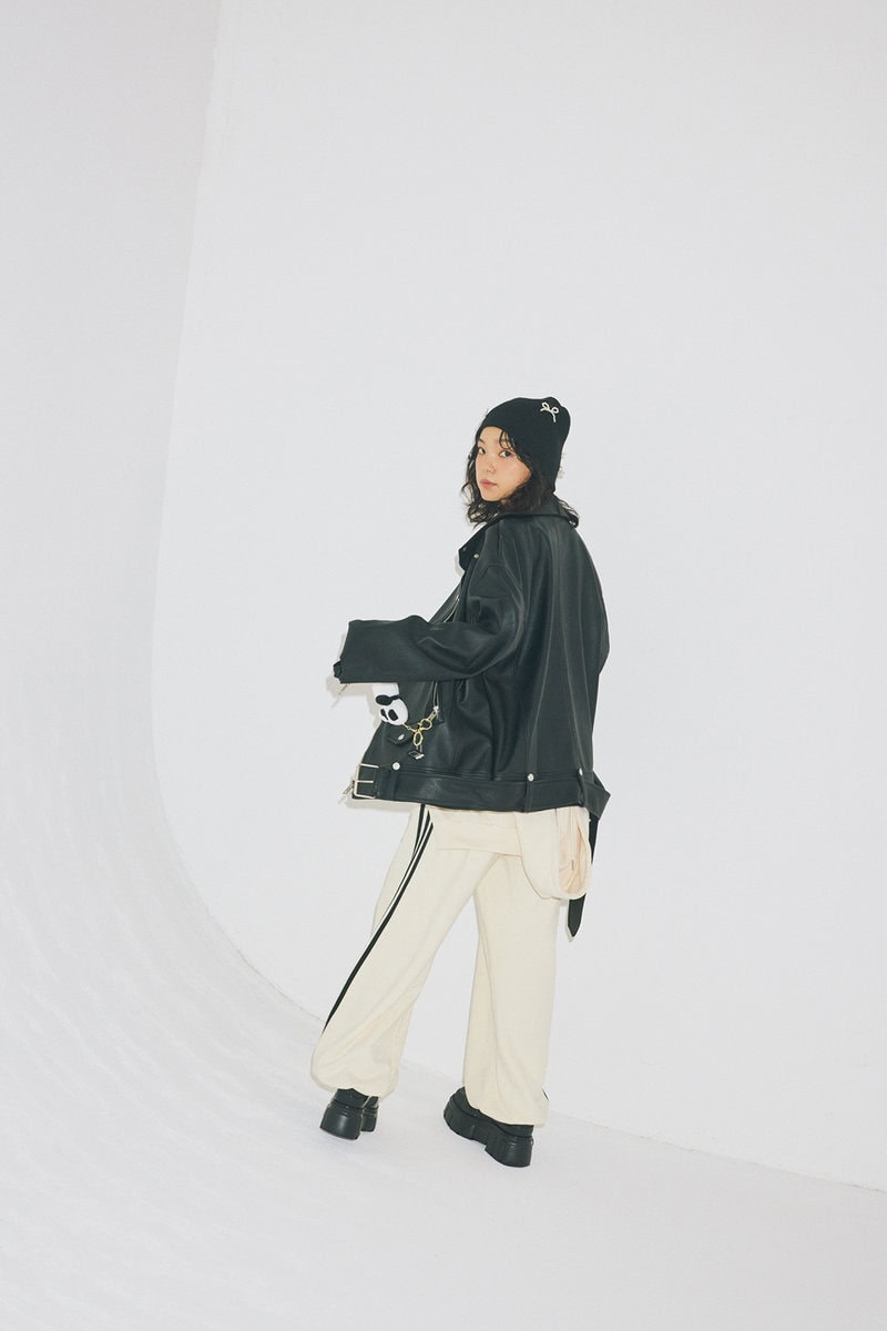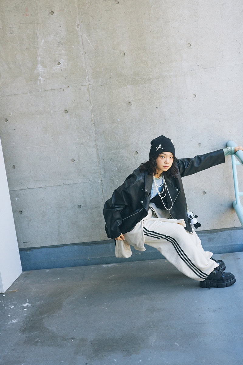 スウェットパンツ¥6,600、腰に巻いたフーディ¥7,150/ともにHOLY IN CODE、レザージャケット¥11,280/ASCLO、パンダキーリング¥5,840/MUCENT、トップス¥12,988/13MONTH、ニット帽¥2,090/3.3フィールドトリップ(ALAND/アダストリア)、パールネックレス¥27,500/ロドリリオン(ネペンテス ウーマン トウキョウ)、ブーツ¥24,200/メリッサ(メリッサ シューズ ジャパン)