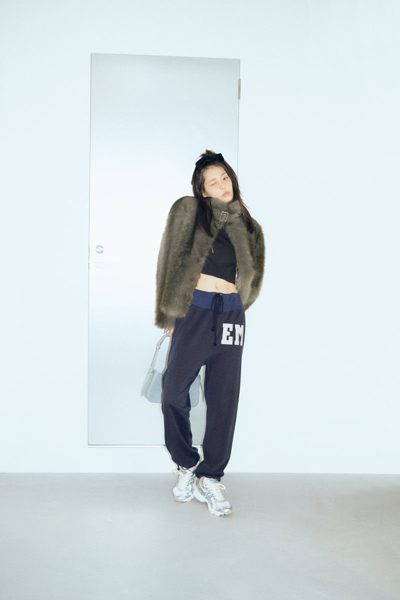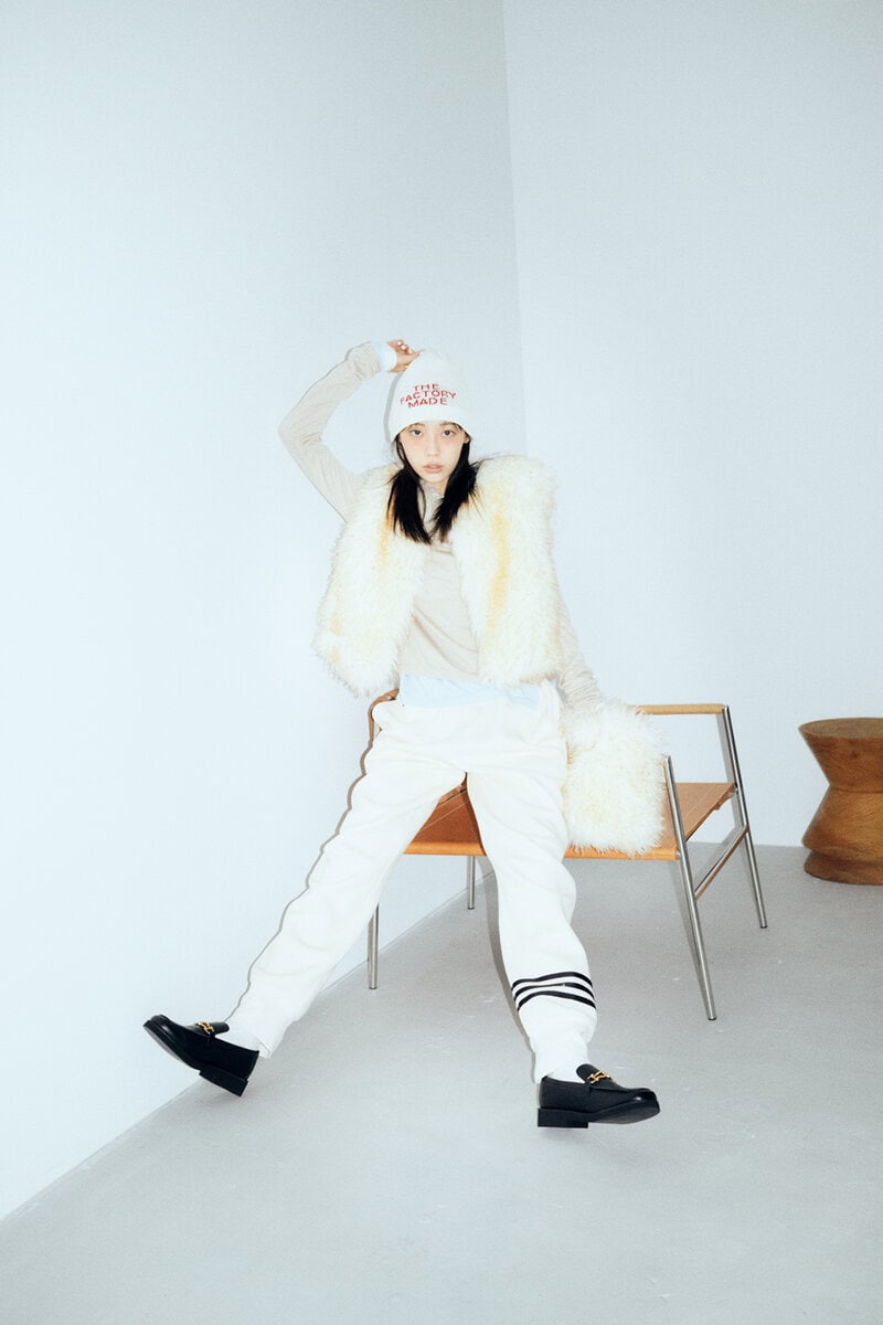 ファージャケット¥15,400 /ラグア ジェム(バロックジャパンリミテッド)、スウェットパンツ¥24,200、キャミソール¥12,100/ともにア ベイシング エイプ®(BAPE STORE® 原宿)、バッグ¥8,800/レイ ビームス(レイ ビームス 新宿)、イヤカフ¥1,078、シルバーネックレス¥1,760/ともにアネモネ(サンポークリエイト)、パールネックレス¥3,300/LHME(シアン PR)、ソックス¥770/靴下屋(タビオ)、スニーカー¥15,400/アディダス オリジナルス(アディダスお客様窓口)