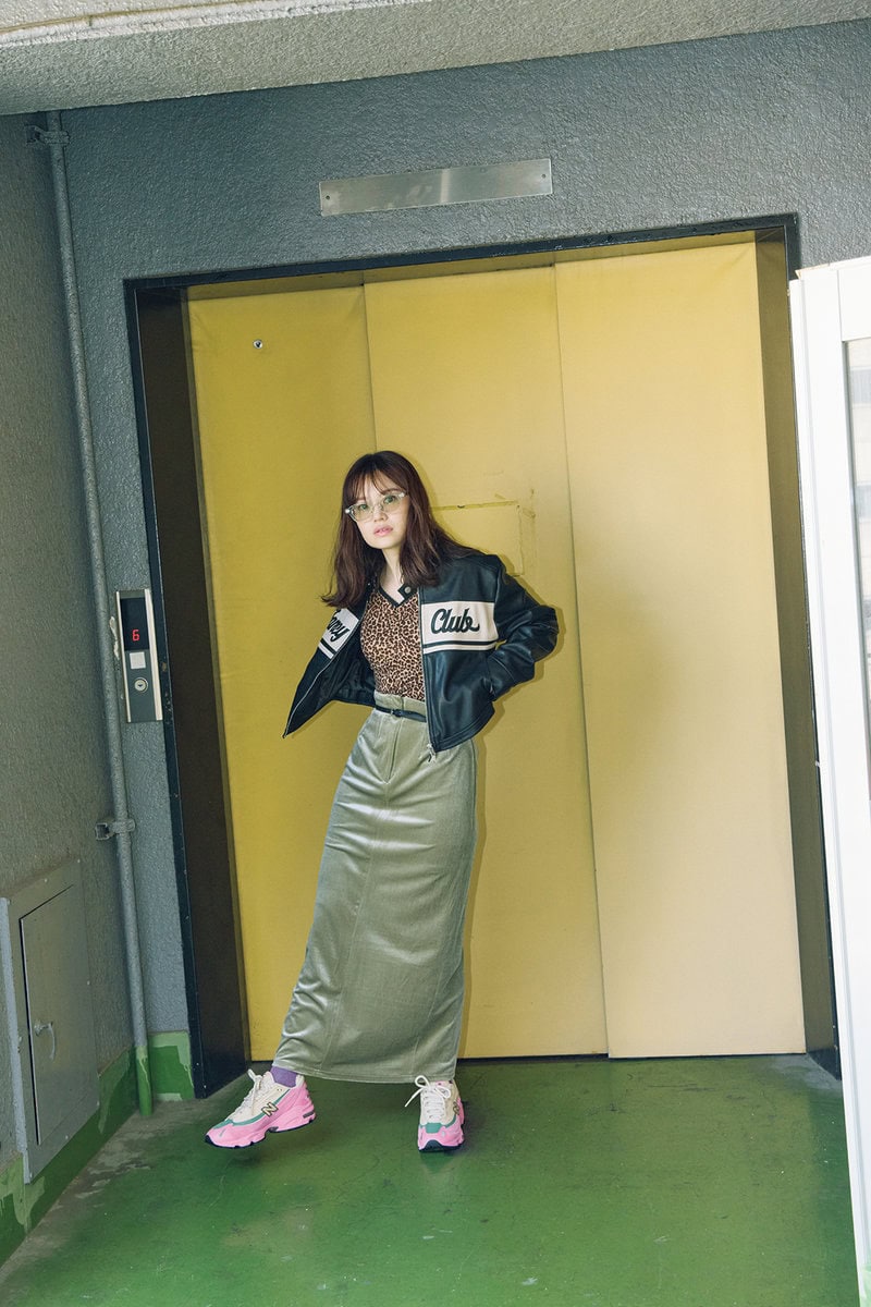 スニーカー¥22,000/ニューバランス(ニューバランスジャパンお客様相談室)、レザージャケット¥15,573/ナスティーファンシークラブ(スクリーンショット)、トップス¥4,950/ラグアジェム(バロックジャパンリミテッド)、スカート¥8,690/エモダ(エモダ ルミネエスト新宿店)、サングラス¥42, 900/ミスタージェントルマン アイウェア(ジョイ エブリ タイム)、ソックス¥1.210/靴下屋(タビオ)