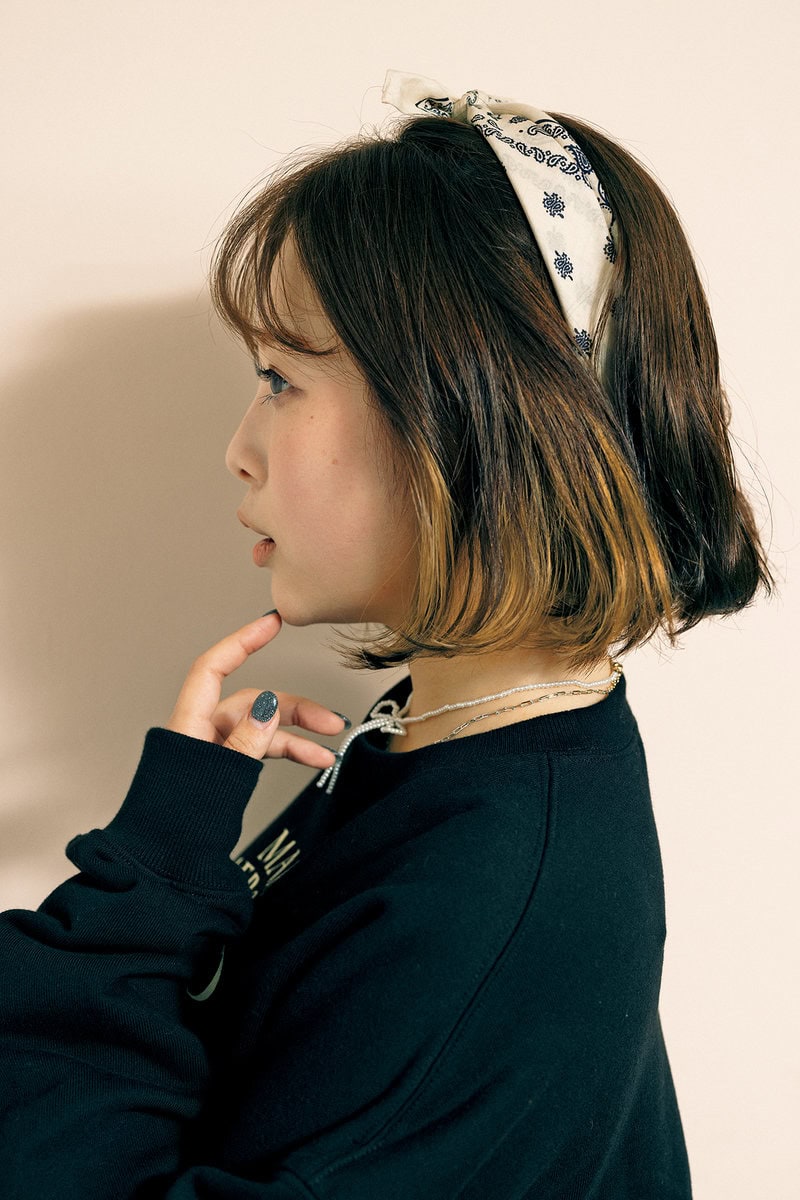バンダナ¥4,400/マウジー(バロックジャパンリミテッド)、パーカ¥35,200/ア ベイシング エイプ®︎(BAPE S TORE®︎ 原宿)、タンクトップ¥5,500/ブッシーパーク(UTS PR)、デニムパンツ¥ 14,080/エモダ(エモダ ルミネエスト新宿店)、リボンチョーカー¥1,690/ナディア フローレス エン エル コラソン、大判スカーフ/ヘアメイク私物