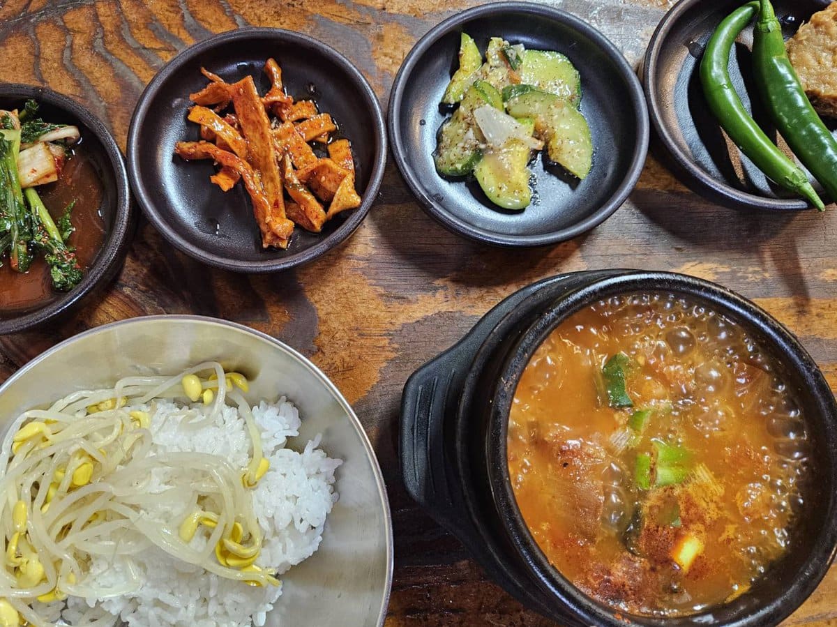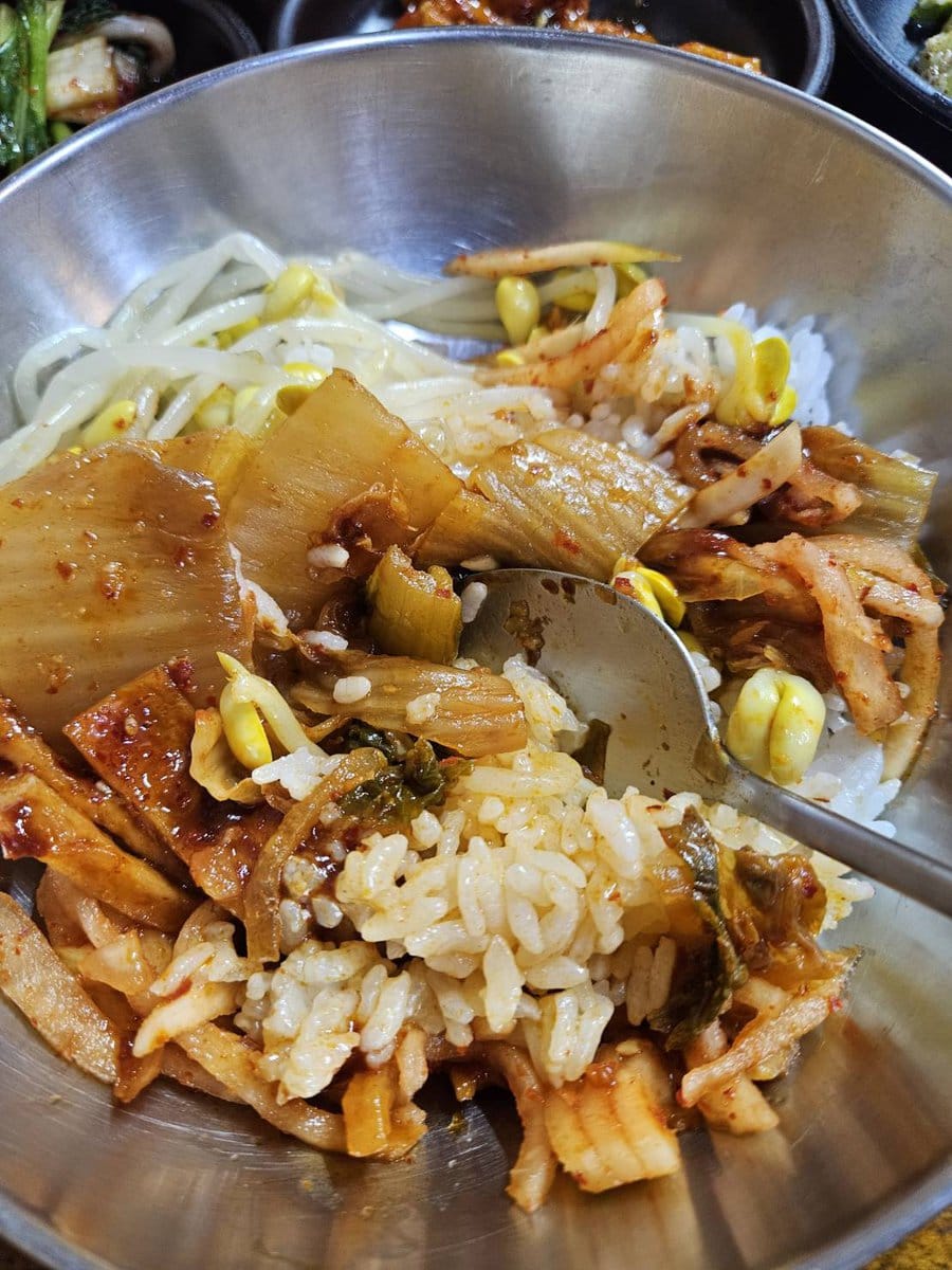 トゥッペギチッはゴハンにチゲをかけて自分でビビンバにして食べるお店なので(だからゴハンの上にもやしが乗ってるんですね)、机に置かれたコチュジャン(大根の酢漬けみたいなのもあったかも?)、小皿のおかずも入れて大胆に混ぜて食べてください! 別日に食べたスンドゥブチゲもすごくおいしかったし、意外と味が違うから、どっちが好みか味比べしてもらいたいです。
