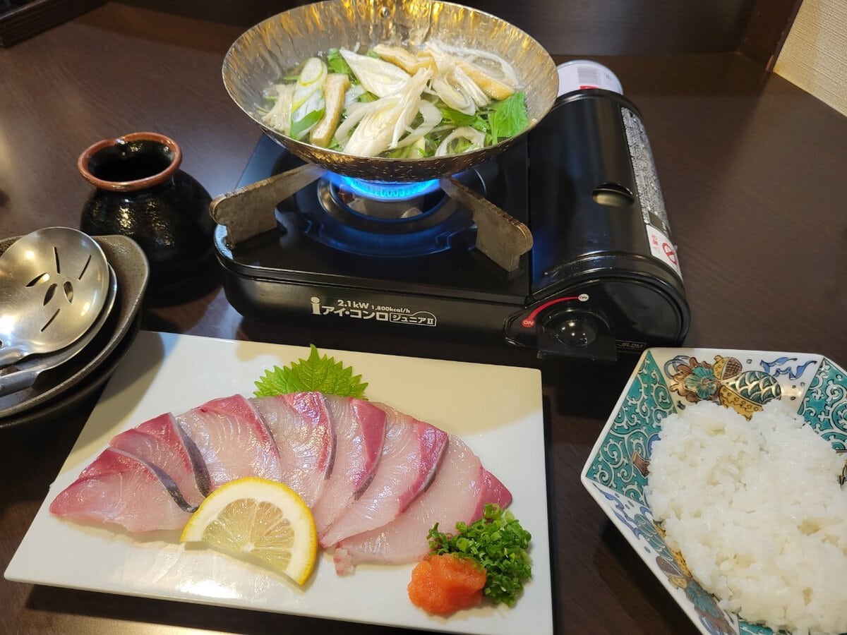 加賀温泉駅のロータリー沿いにある「くいもん家 ふるさと 加賀店」で昼食を。海鮮丼、カニ丼、ブリしゃぶなど魚介メニューが目白押しで迷いに迷って、私はブリしゃぶをチョイス。