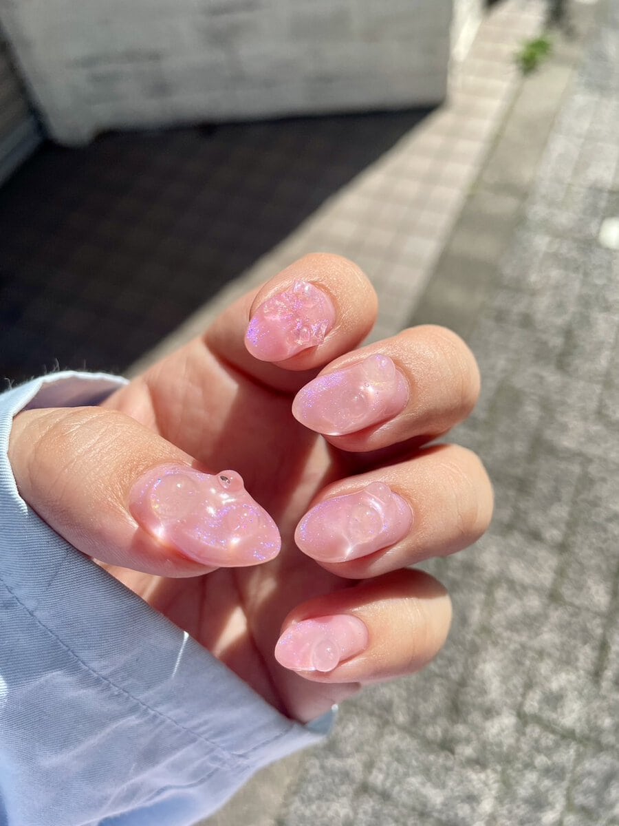 とんがりの形が気に入って継続。単色いいなぁと思い、迷ったときはピンク。光にあたるとオーロラっぽくキラキラ光るラメピンクに、クリアの丸いパーツをバランスよく乗せて立体感を。うるうる可愛い。