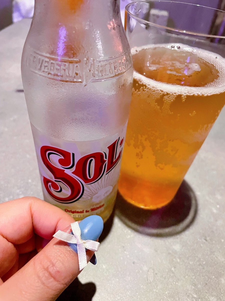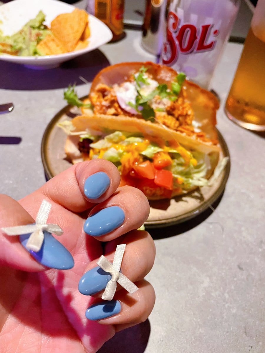 金属やプラのリボンパーツは何度も乗せてたけど、ここにきてちびリアルリボン素材がサロンに入荷とのこと。“絶対付けたい!”と申し出ます。リボンが立体的で大きいから、ベースは単色でシンプルに。9月、とにかく暑かったから涼しげな水色ちゃんに。爪はいつもより長さを残して、ちょっととんがった形にしてさみしさを回避。可愛い~♡ 大人~♡ “リボンにカレーとか醤油つけたら取れないよ、終わりだからね。洗い物にも注意して!”と言われたので、いつもはなんにも気にせず素手でガシガシ洗うのに、帰り道にゴム手袋を購入。生まれて初めての手袋をつけた食器洗いも経験。1週間くらいでボンドが弱ってリボンはとれました。いつの間にかなくなるリスクもあるので、スペアのリボンも同時に買っておくのが吉だと思う。