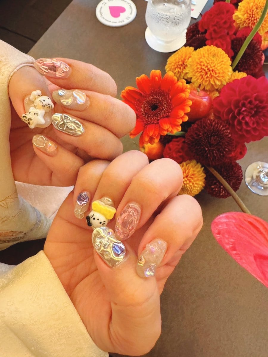 シンプル続きでゴテゴテが恋しいターンに。ヒョウ柄のリボンをつけたキティは、どっちも可愛くて選べなかったから2個乗せ。ほかのパーツはシルバーをベースに、あまり色が主張しすぎないパーツで盛り。♡、リボン、★、花など、“ときめく~♡”と思ったパーツを欲張りに。ピンクの♡型ホロを敷き詰め、ぐるぐるクリアで閉じ込めて。結果、ギラギラして目に入るたびハピネスな指先が完成しました♡