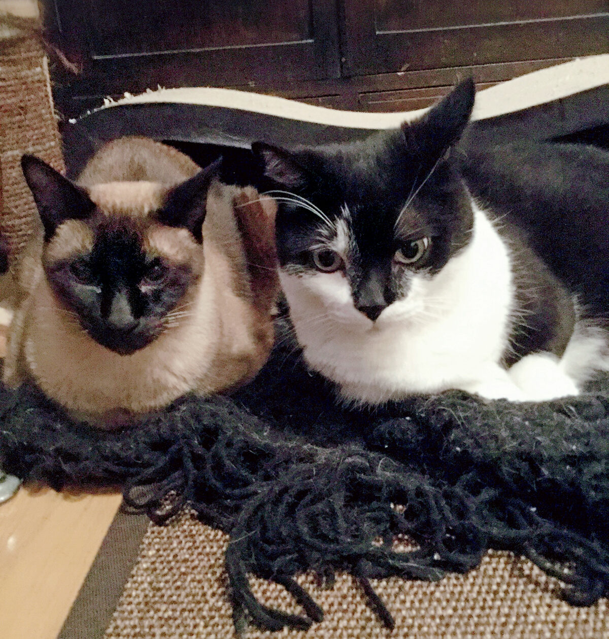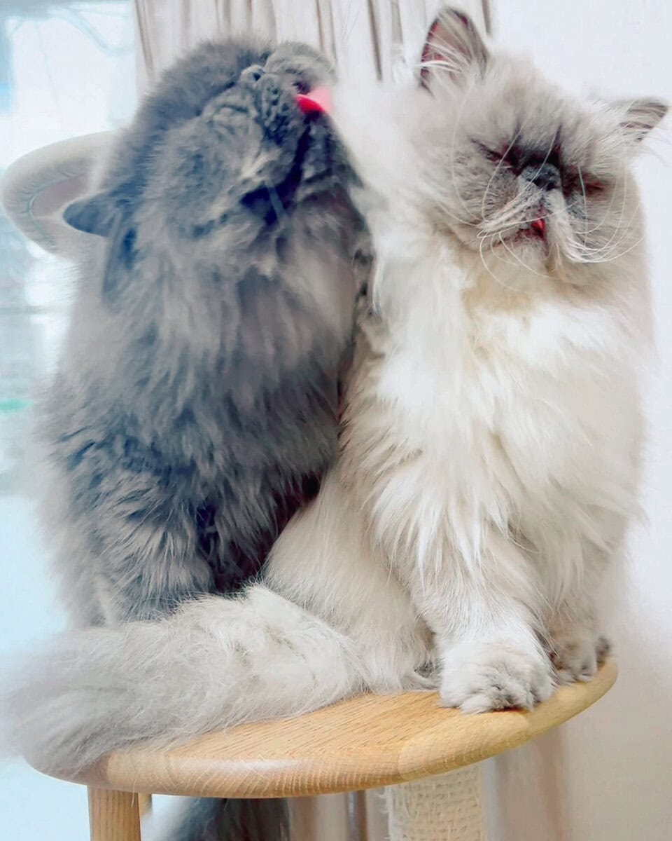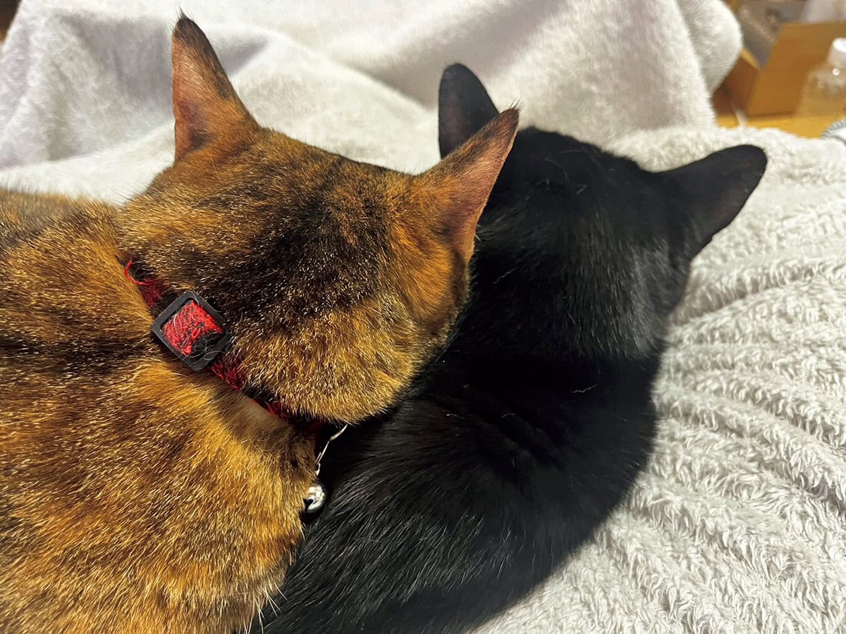 「ガルは暑がり、ルパンは寒がりで2匹間の温度差が激しいです。それが寝方にも影響していて、2匹と一緒に寝るのですが、ガルは私の枕の上、ルパンは布団に入ってきて左わきの下にアゴをのせて寝ます。つまり、冬の夜はもふもふ♡パラダイスです」ライター白倉綾子さん