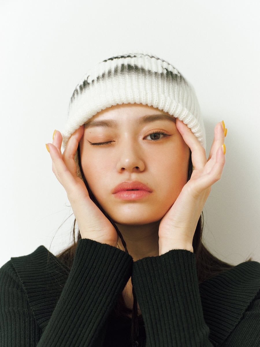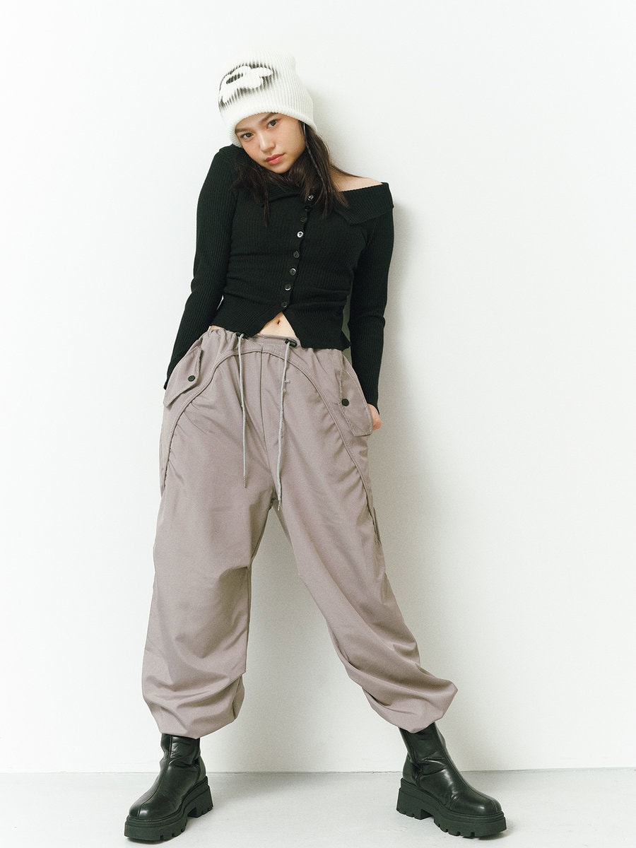 オフショルニット¥3,289/スピンズ、トラックパンツ¥5,499/フィグメンツ、ビーニー¥1,429/ウィゴー、ピアス、ブーツ/スタイリスト私物