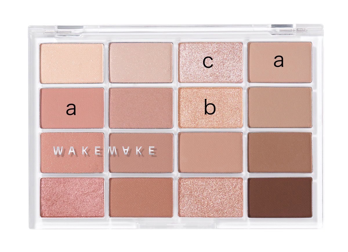 アイシャドウは横長を意識すると今っぽく盛れる♡ aの2色を混ぜてアイホールから眉下まで幅広めにのせる。下まぶたも同じ色で囲んで。涙袋にbをのせて、ふっくらと見せる。cを目頭に入れ、抜け感を作る。