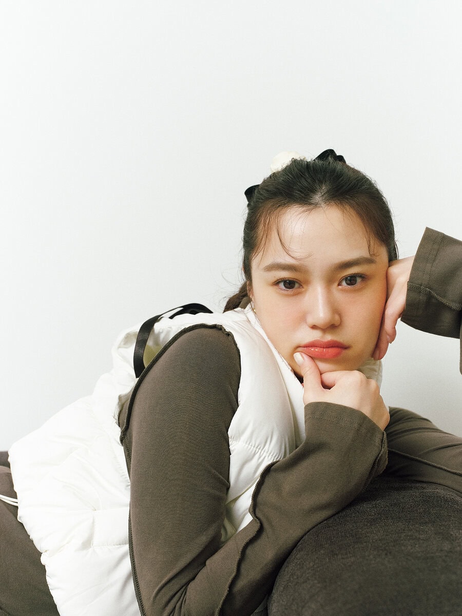 ショートダウンベスト¥4,399/ウィゴー、ワンピース¥11,990/マウジー(バロックジャパンリミテッド)、ローズリボンバレッタ¥1,870/アネモネ(サンポークリエイト)、ピアス/スタイリスト私物