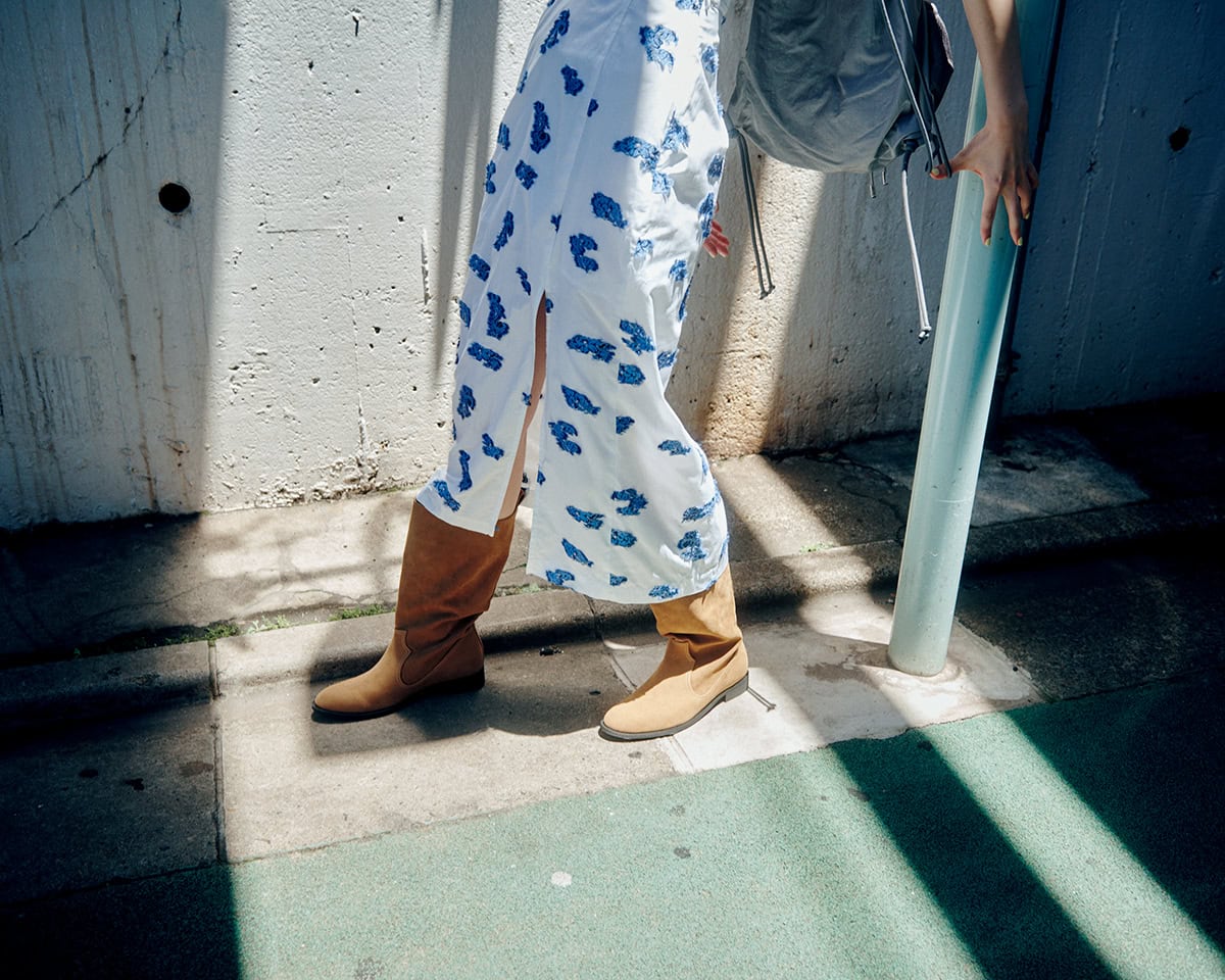 柄タンクを一枚でさらりと着こなした一方、足元はロンスカ×ブーツで重ために仕上げてこなれ感を出してみた。