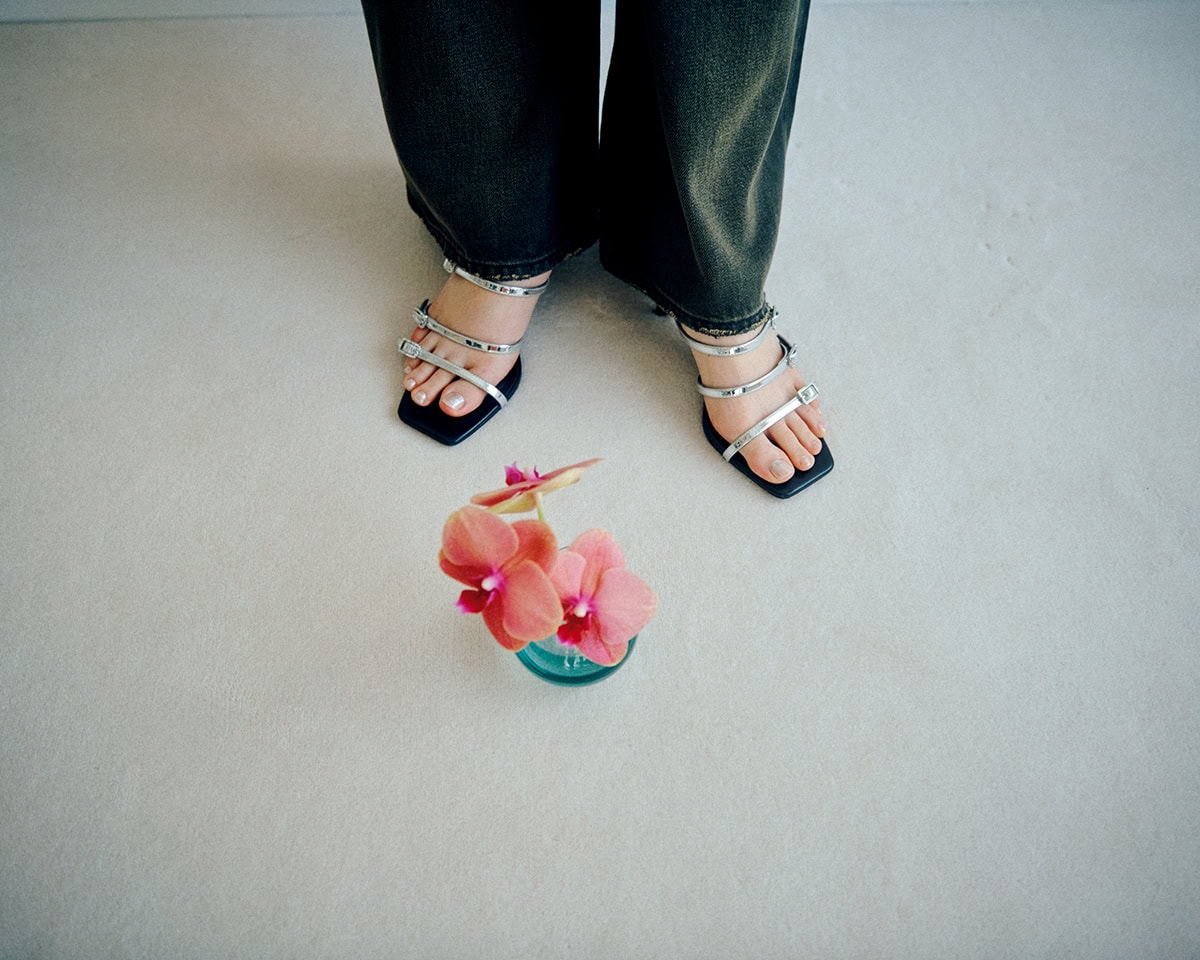 Tシャツ¥4,840/ACLENT、デニム¥14,300、ヘアピン[2SET]¥5,500/ザ ヴァージンズ、ミュール¥8,900/チャールズ&キース(チャールズ&キース ジャパン)