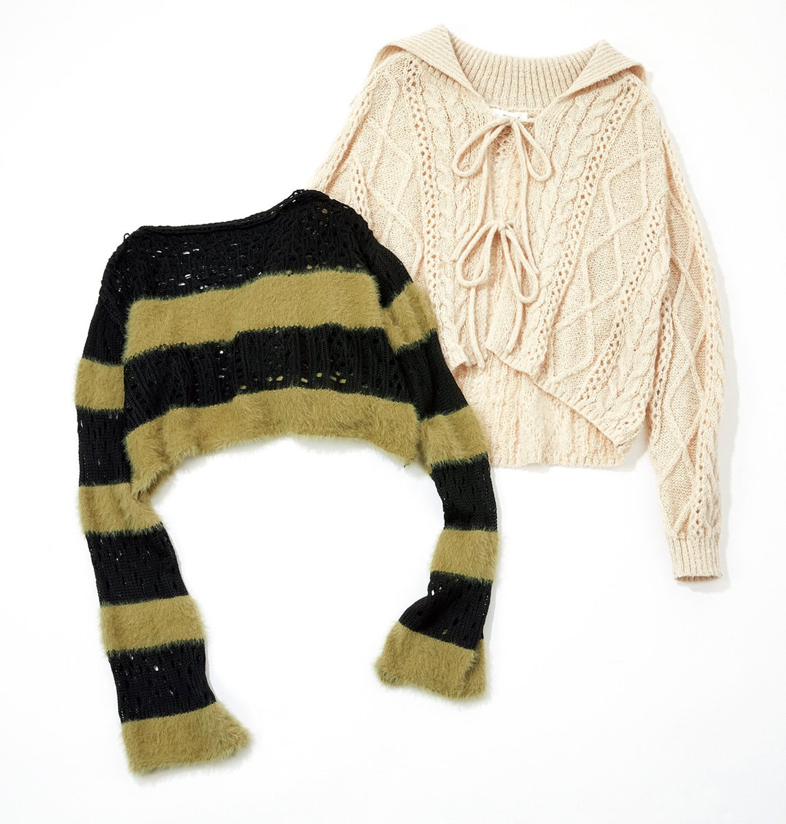 1.ゆったりはおれるローゲージカーデ。大きな襟とリボン紐がポイントに! ¥3,299/ウィゴー、2.バイカラーニットでボーダーをデザイン。クロップト丈なら今っぽいシルエットが完成。¥2,969/ウィゴー ディスパーク