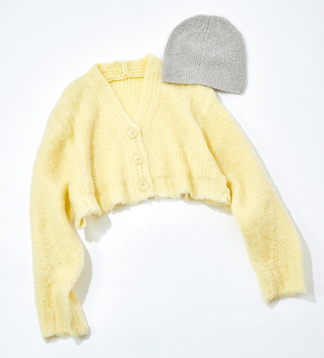 リラックス感のあるループニットのカーディガン。アイスブルー×ショート丈が旬度高め。¥2,799/GRL