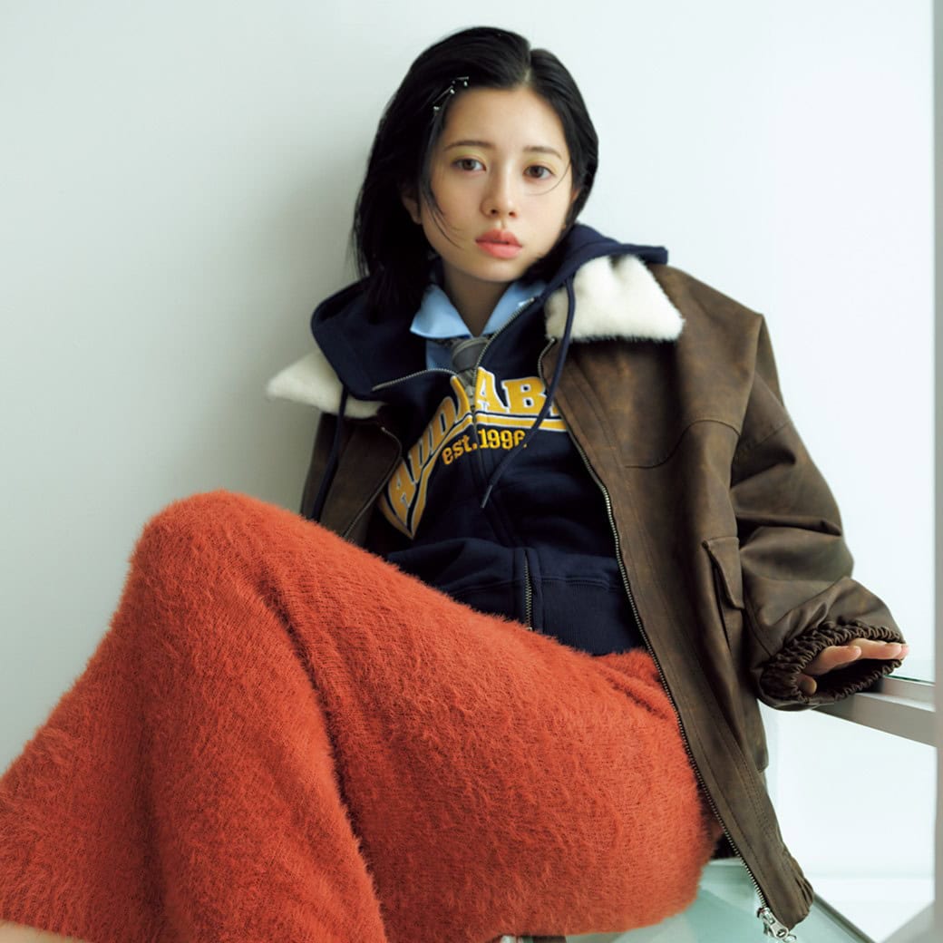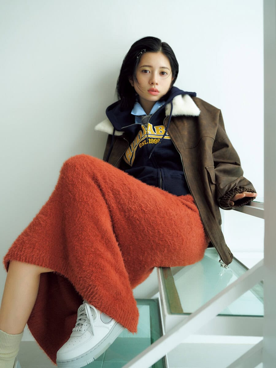 ニットロングスカート¥4,620/Lull、ファー付きレザージャケット¥6,589、ジップパーカ¥5,489、シャツ¥2,750、ネクタイ¥1,100/以上すべてスピンズ、ヘアピン[3本セット]¥1,870/ゴールディ、ソックス¥1,650/靴下屋(タビオ)、スニーカー¥18,920/ナイキ スポーツウェア(NIKEカスタマーサービス)