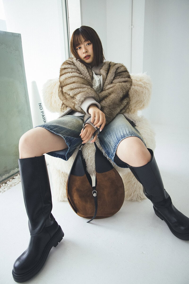 ファーブルゾン¥13,200/ラグアジェム(バロックジャパンリミテッド)、ブーツ¥18,900/チャールズ&キース(チャールズ&キース ジャパン)、ニット¥13,200/レイ ビームス(レイ ビームス 新宿)、パンツ¥46,200/ディーゼル(ディーゼル ジャパン)、バッグ¥40,700/アーカイブエプク