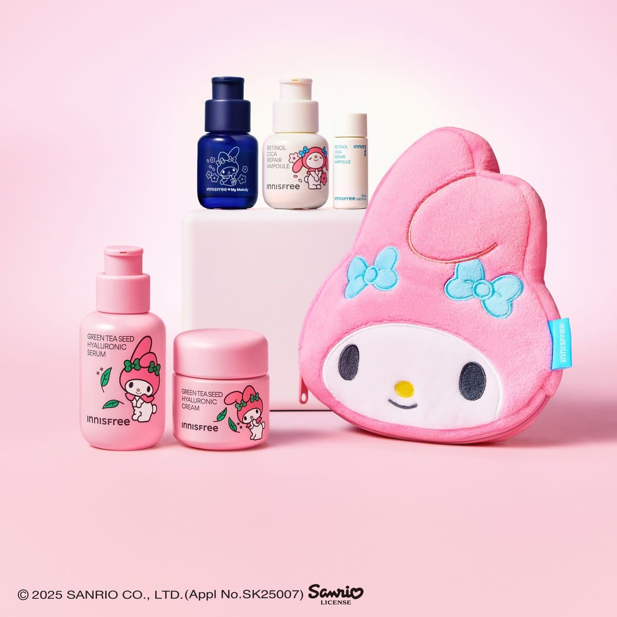 マイメロディ日本限定コラボレーションセット。イニスフリーの代表製品「レチノールシカリペアセラム」現品に、特典としてトラベルにも便利な同製品のミニサイズ、水色のリボンがアクセントになったマイメロディのキュートな限定ポーチがついてくる豪華3点セットです。まさにマイメロづくし!
