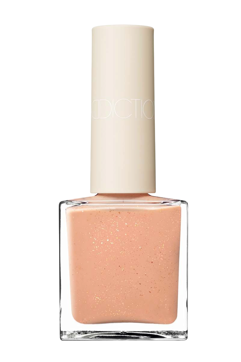 ガラスのようにクリアなツヤで、ゴールドがチラキラと輝くシアーベージュネイル。速乾なのもうれしい。¥2,420/アディクション ビューティ