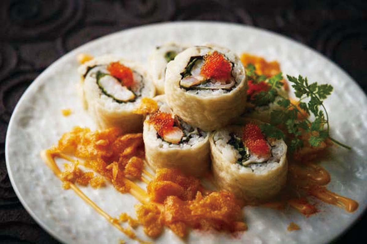 新感覚の揚げ蒲鉾が食べられる大人気店。巻き寿司風のハチマルロール(数量限定)¥1,280、とろ〜り卵のウッフ・ド・ロワイヤル〜焦がしにんにくバター醤油〜¥880は注文必須!