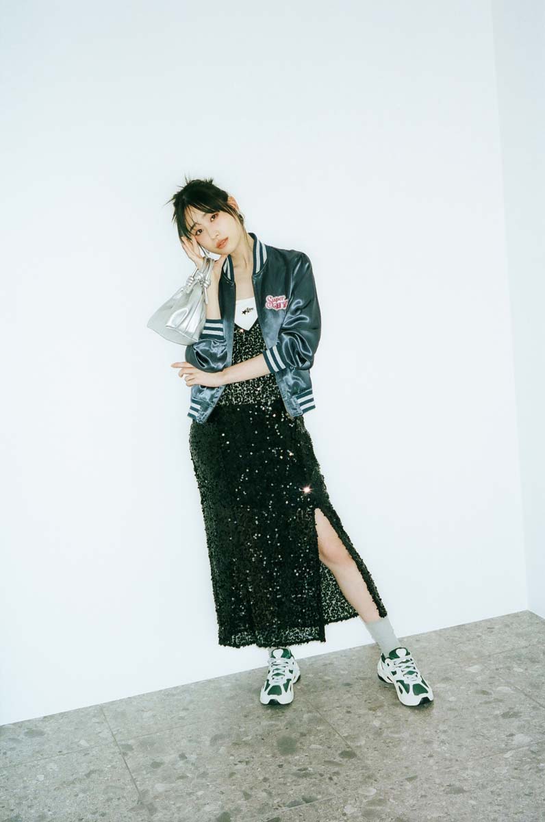 スパンコールキャミワンピ¥46,200/バウム・ウンド・ヘルガーテン、バッグ¥19,800/ヴィスク(ともにS&T)、スカジャン¥77,000/ヒステリックグラマー、中に着たキャミ¥12, 200/A BATHING APE®(BAPE STO RE® 原宿)、イヤリング¥9,680/ソムニウム、スニーカー¥11,330/ナイキ スポーツウェア(NIKE カスタマーサービス)、ソックス/スタイリスト私物