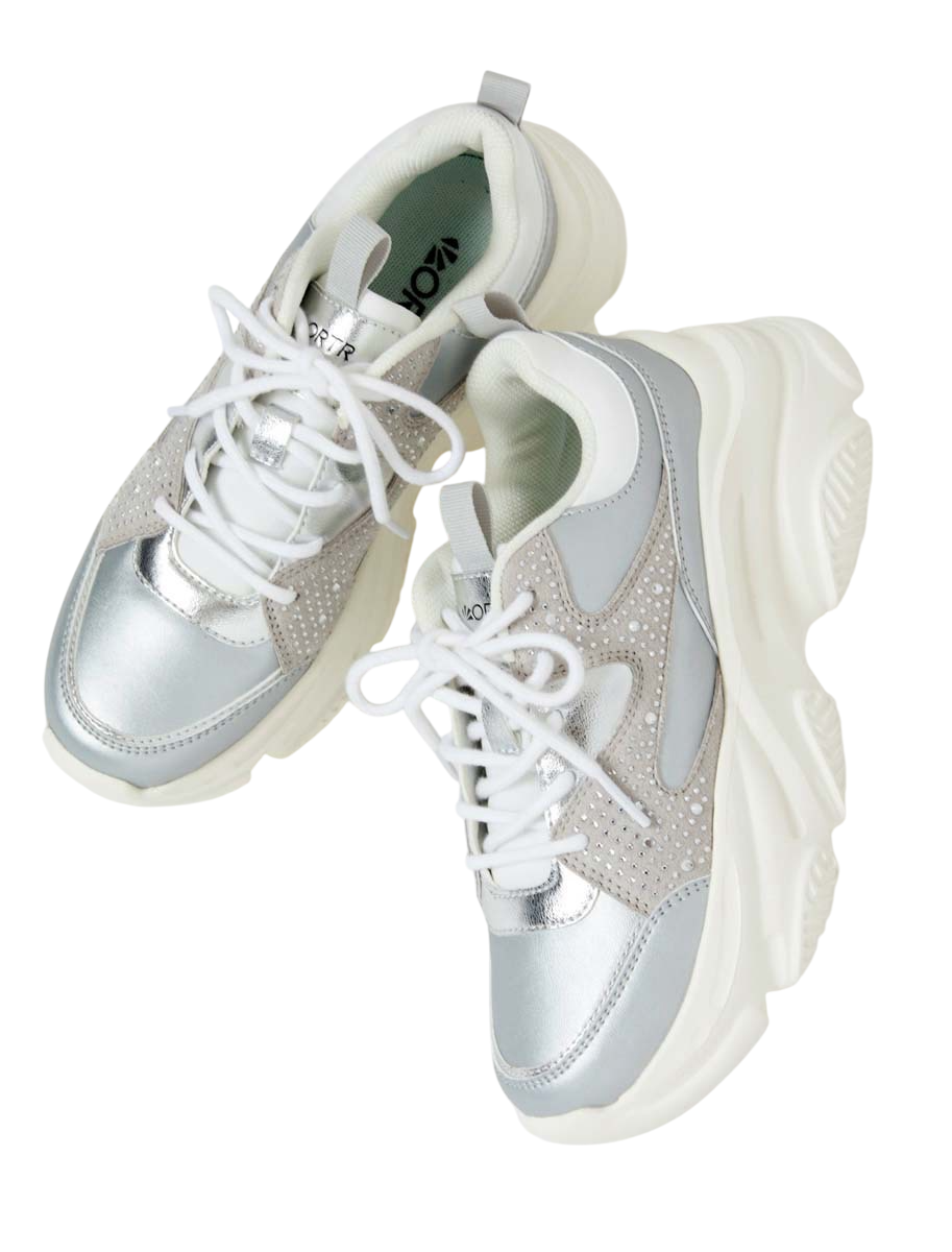 【上から】踊りだしたくなるような、Y 2Kっぽ光沢カーゴパンツでパワーチャージ! ¥14, 300/ラグア ジェム(バロックジャパンリミテッド)、ギラついたメタリックの厚底スニーカーで、足元からしっかり盛ってこ〜! ¥8,800/オーアールティーアール(ダブルエー)、サテン生地×刺しゅうのワンポイントで、ラフだけど高級感のあるコーデが完成。¥60,500/A BATHING APE®(BA PE STORE® 原宿)