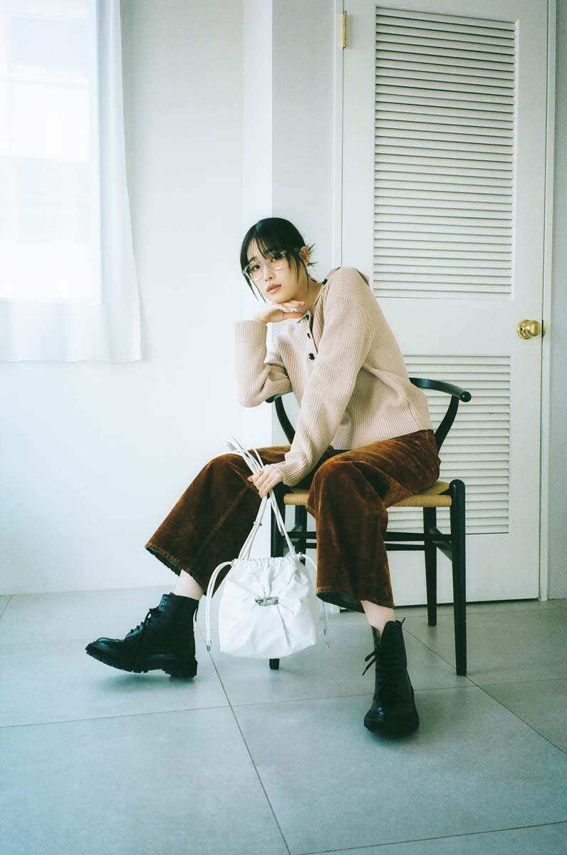 ベロアパンツ¥20,900/ラグア ジェム(バロックジャパンリミテッド)、ニット¥46, 200/バウム・ウンド・ヘルガーテン(S& T)、メガネ¥28,600/WAITING FOR THE SUN(リーンスプリング)、リング¥3, 850/ミミサンジュウサン(サンポークリエイト)、バッグ¥83,600/ディーゼル(ディーゼル ジャパン)、ブーツ¥86,900/アデュー(バウ インク)