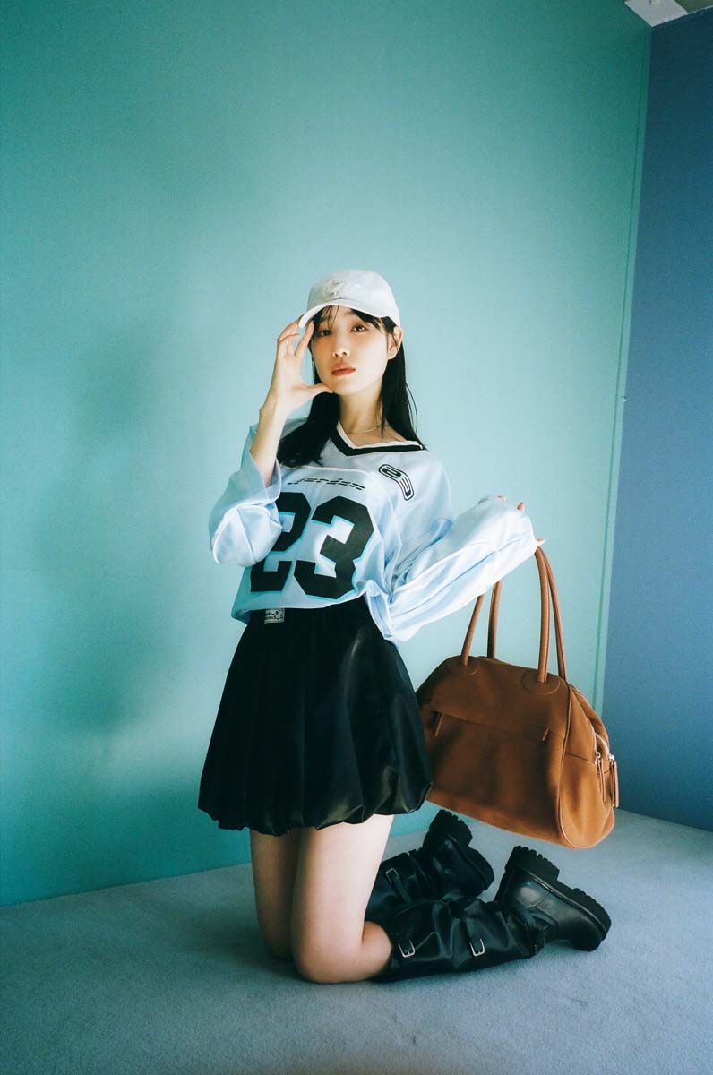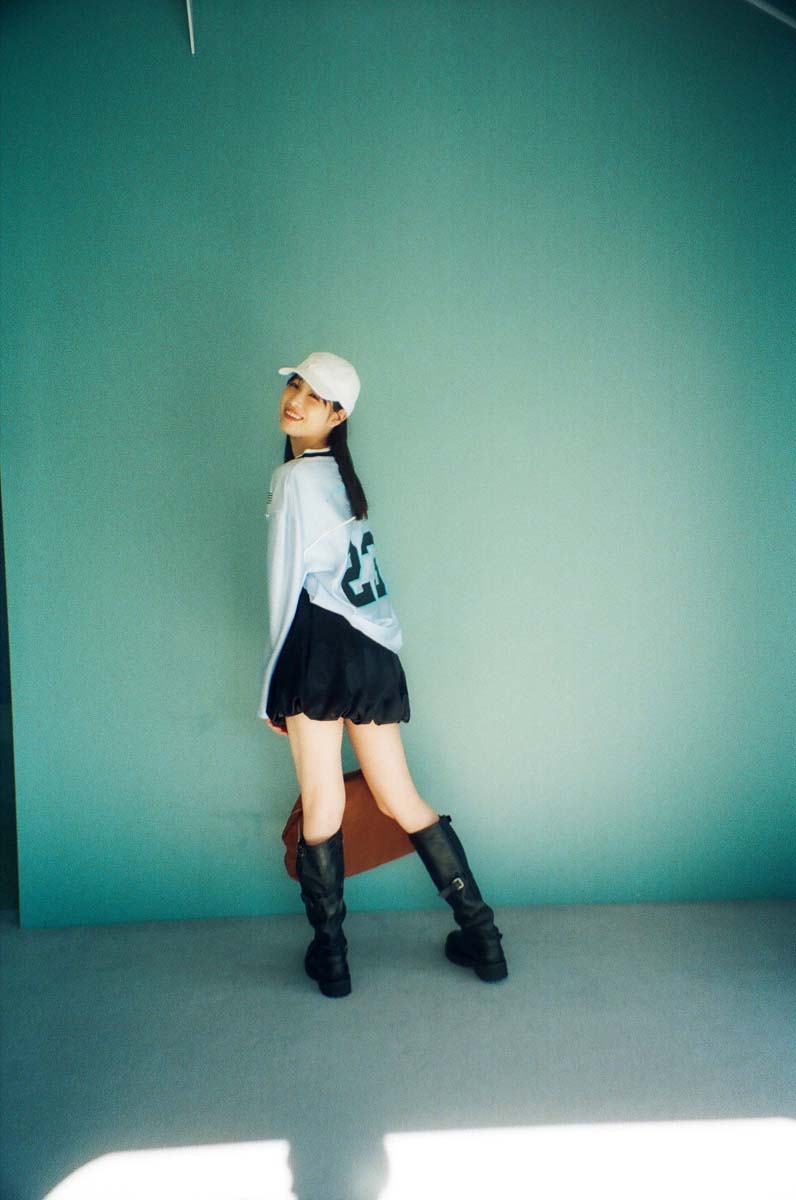 ユニフォームシャツ¥10,780/ジョーダン ブランド(アトモス ピンク フラッグシップ 原宿店)、バルーンスカート¥17,050/マルディメクルディ(マルディメクルディジャパン)、キャップ¥3,960/カオリノモリ(オーバーライド ルミネエスト新宿)、ネックレス¥2,200/ゴールディ、バッグ¥24,070/クリスティーンプロジェクト(ハナ)、ロングブーツ¥49,500/ALM.