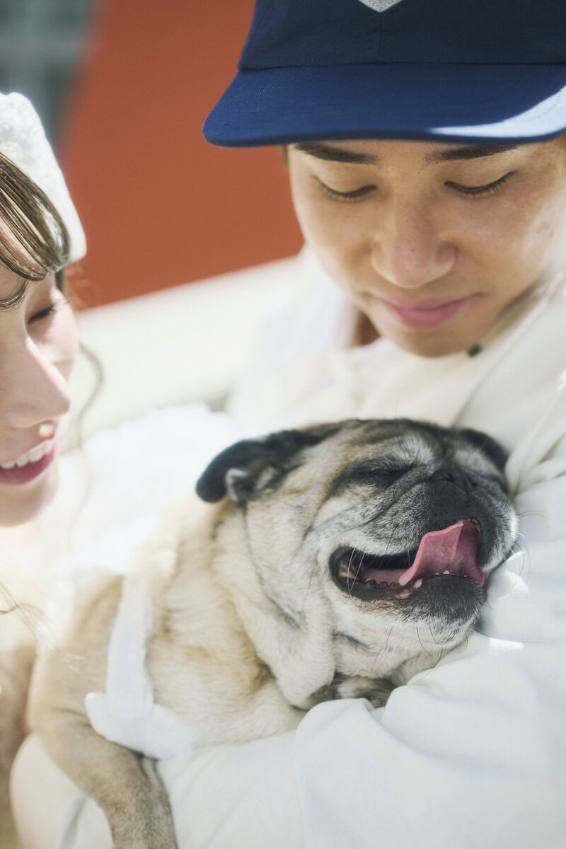 ウェディングらしさのある白ドレス&スーツだけど、足もとはおそろいのナイキスニーカー。サグワくんのキャップにこめられた「I LOVE YOU」が洒落てます! 愛犬・ふくちゃんも白ドレスに身を包んで♡ きゃわわ!