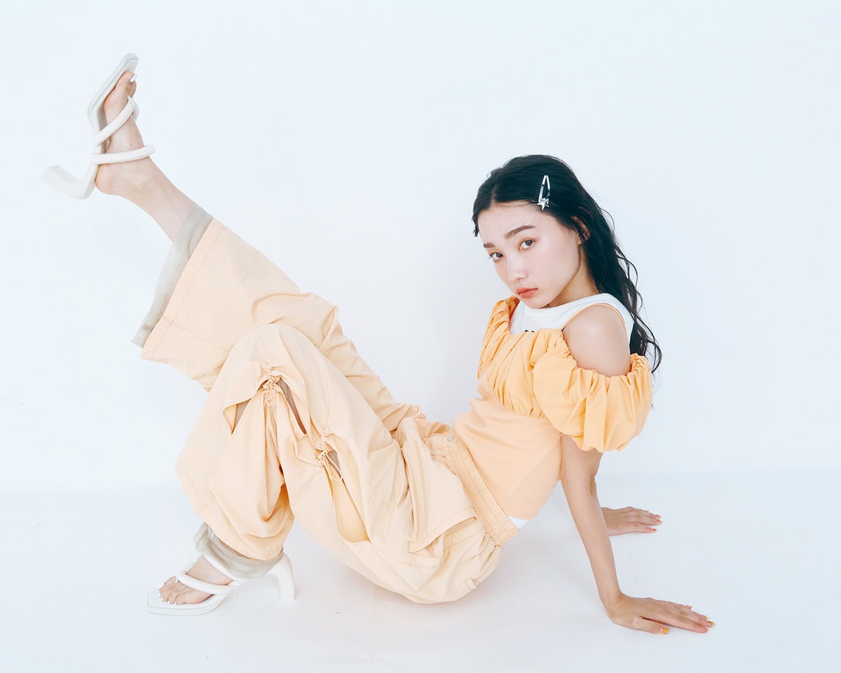 ボリュームスリーブトップス¥7,480、ナイロンパンツ¥12,980/ともにマウジー(バロックジャパンリミテッド)、タンクトップ¥2,199/ウィゴー、スターヘアピン¥1,098/スピンズ、サンダル¥10,900/チャールズ&キース(チャールズ&キース ジャパン)