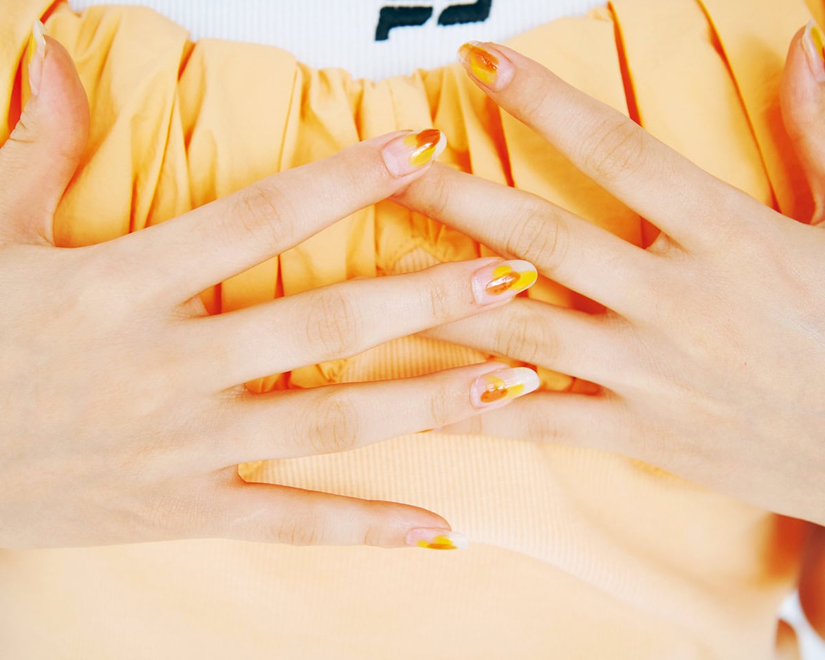 クリアベースに、イエロー寄りのオレンジと、渋めのオレンジのネイルをラフに塗って。てきとーなバランスが可愛い!