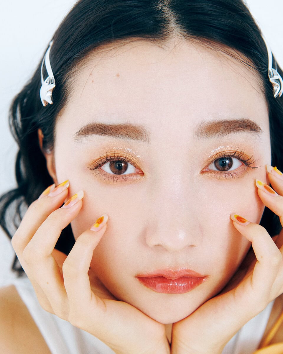 二重の少し上に入れた流れ星ラインがポイント。オレンジのアイシャドウをアイホールと下まぶた、ブラウンシャドウを二重幅と下まぶたキワに重ねて。シルバーのラメシャドウを細いブラシに取ってまぶたにスッと引いたら、アイキャッチが入ってウルウル目に。オレンジチークは黒目下、小鼻横に丸く入れて。