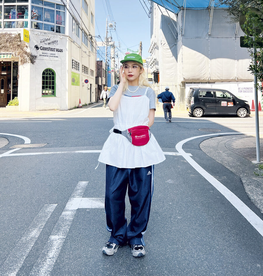 古着とも相性抜群のUSAロゴコンパクトTにキャミワンピを重ねて、ボトムスと キャップでカラーを取り入れました。リムレスメガネはカジュアルにも取り入れやすく、今っぽさとシャープさがプラスされます。