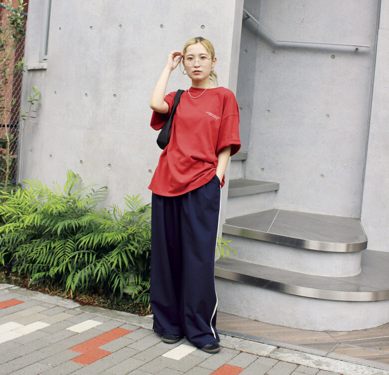 Tシャツ¥5,500、メガネ¥4,400、タックパンツ¥13,200、ネックレス ¥4,950、ピアス¥4,950、バッグ¥7,700/以上すべてアングリッド、その他/本人私物