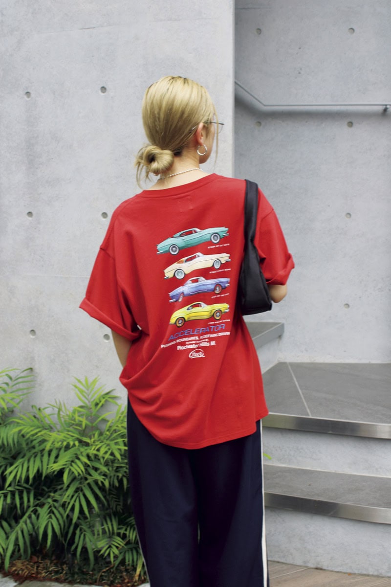 Tシャツ×ラインパンツのスポーティな着こなしは、フレームの色や形に左右されずコーデにプラスしやすい、旬なリムレスメガネを合わせてオシャレにアップデ ート。車のプリントTは後ろ姿まで可愛いんです♡