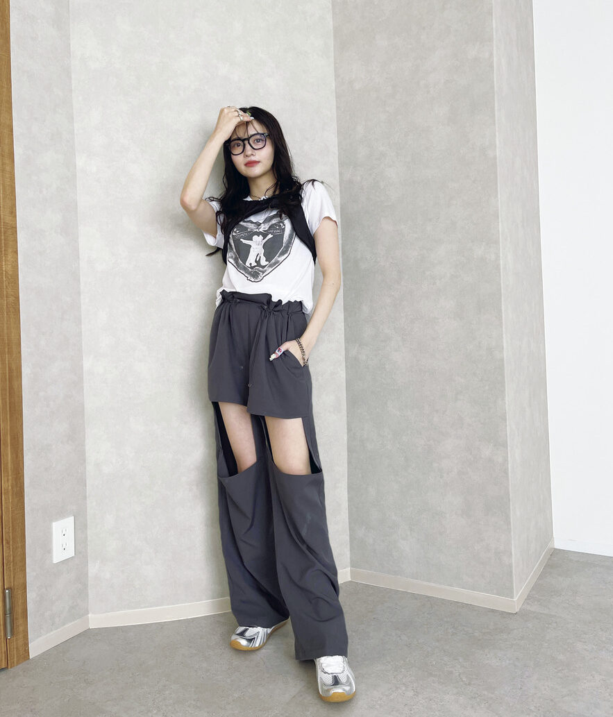 Tシャツ¥8,882/OPEN YY、ベスト¥12,639/mischief、シューズ¥16, 458/HOES OLDORDER(以上すべてBUYMA)、MAISON ELLIEのボトム、バレンシアガのブレスレット、un by Tomoyo Yoshidaのアクセサリー、ASAMI FUJIKAWAのアクセサリー、その他/以上すべて本人私物