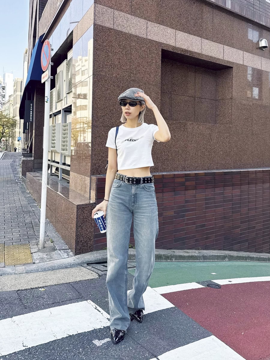 ショート丈のTシャツとハイウエストデニムでスタイルアップ。 全体的にシンプルなのでハンチングやベルトをアクセントにしました。メガネはオーバルフレームが強すぎず、どんなコーデにも合わせやすいです。