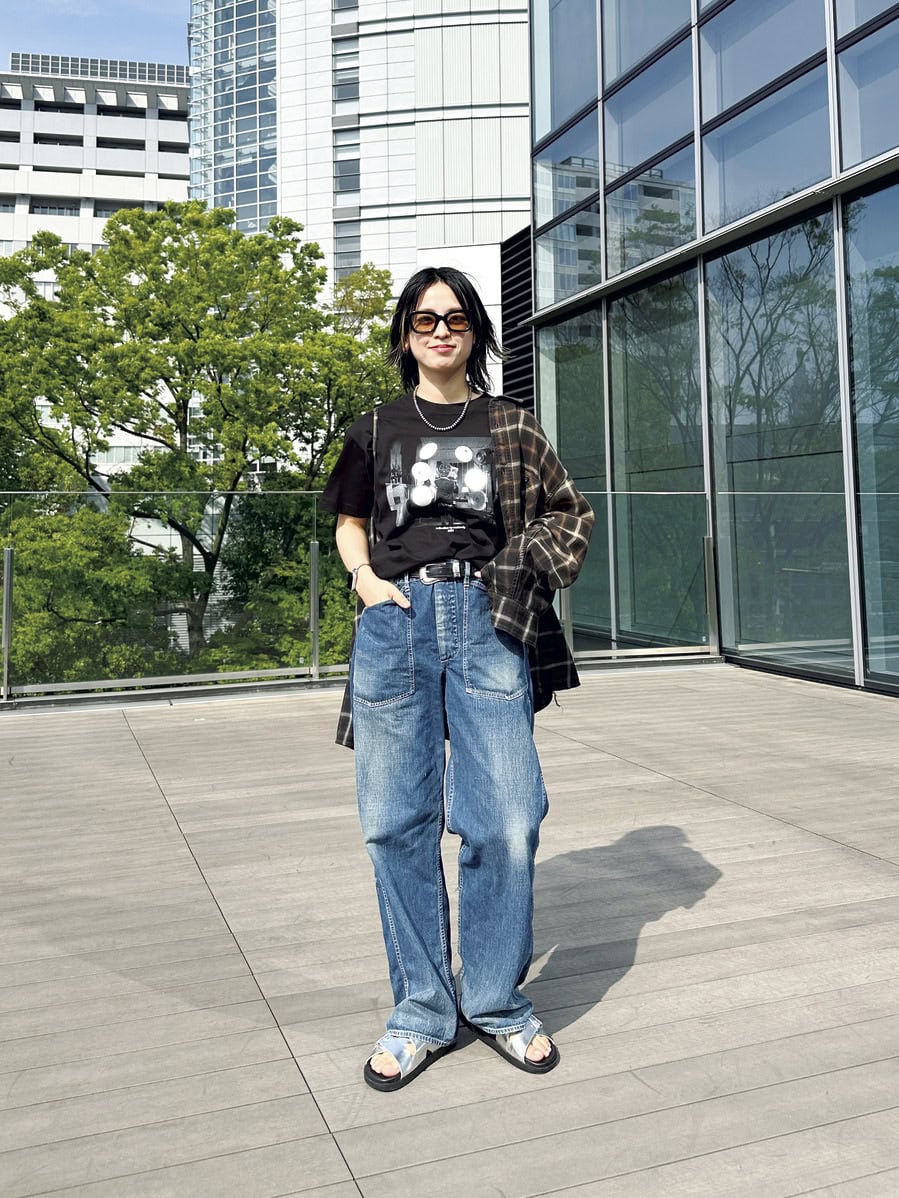 Tシャツ¥7,700、シャツ¥24,200/ともにマチュアリー、サンダル¥17, 600/プラクトン(以上すべてビームス ウィメン 原宿)、デニムパンツ¥30,800/バズリクソンズ × ビームス ボーイ(ビームス ボーイ 原宿)、LA BORのメガネ/本人私物